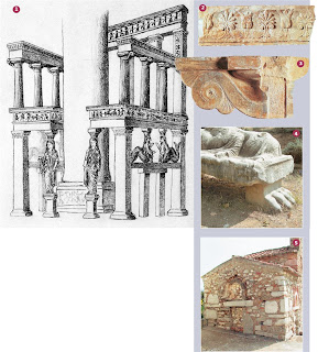 .Σχεδιαστική πρόταση αναπαράστασης του θρόνου του Απόλλωνα στο Αμυκλαίο,με το ξόανο του θεού τοποθετημένο στο κέντρο της κατασκευής.Από τον Χέλμουτ Πρίκνερ (1992) 2. Μαρμάρινη κονσόλα του θρόνου στην οποία συνδυάζονται ιωνικά στοιχεία με δωρικά 3. Τμήμα της μαρμάρινης σίμης (κορνίζας) του θρόνου με φυτικό διάκοσμο 4. Τεράστιο λεοντοπόδαρο που αποδεικνύει ότι ο θρόνος είχε πράγματι τη μορφή καθίσματος.(Το γλυπτό που βρίσκεται επάνω από το λεοντοπόδαρο είναι μεταγενέστερο.) 5. Η εκκλησία του Προφήτη Ηλία (της βυζαντινής εποχής) στην οποία φαίνονται καθαρά τα ενσωματωμένα μαρμάρινα αρχιτεκτονικά μέλη του θρόνου, μεταξύ των οποίων και το τεράστιο κατώφλι