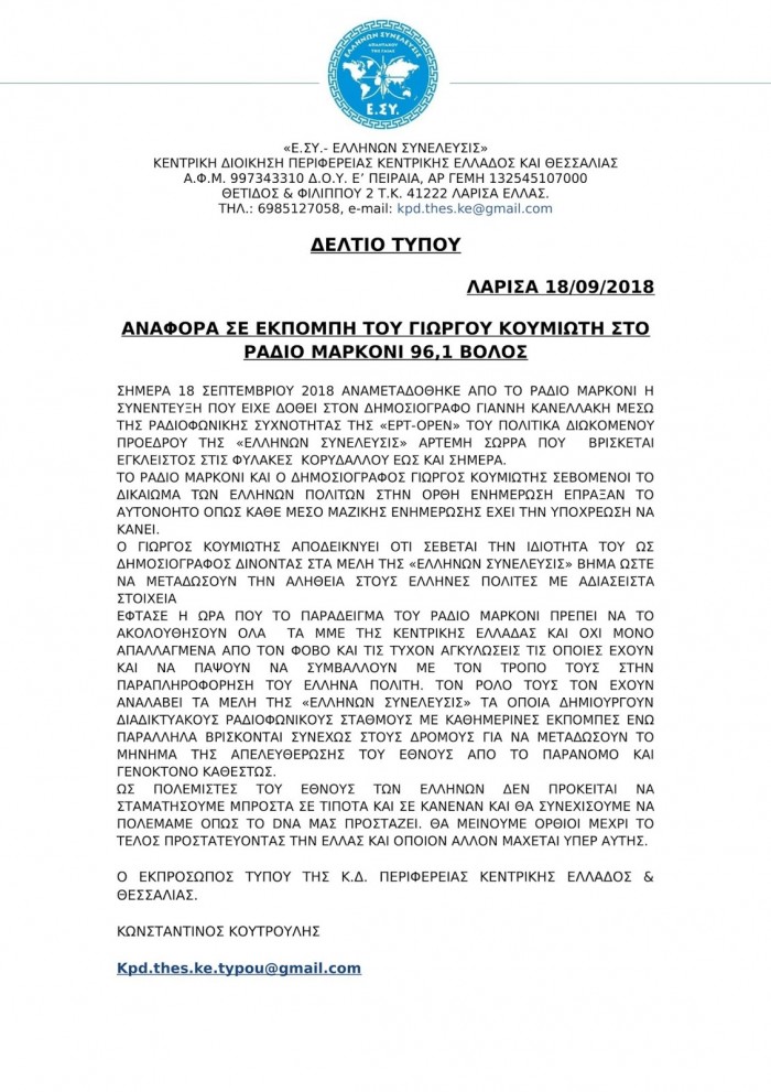 ΤΟ ΡΑΔΙΟ ΜΑΡΚΟΝΙ ΚΑΙ Ο ΔΗΜΟΣΙΟΓΡΑΦΟΣ ΓΙΩΡΓΟΣ ΚΟΥΜΙΩΤΗΣ ΣΕΒΟΜΕΝΟΙ ΤΟ ΔΙΚΑΙΩΜΑ ΤΩΝ ΕΛΛΗΝΩΝ ΠΟΛΙΤΩΝ ΣΤΗΝ ΟΡΘΗ ΕΝΗΜΕΡΩΣΗ ΕΠΡΑΞΑΝ ΤΟ ΑΥΤΟΝΟΗΤΟ ΟΠΩΣ ΚΑΘΕ ΜΕΣΟ ΜΑΖΙΚΗΣ ΕΝΗΜΕΡΩΣΗΣ ΕΧΕΙ ΤΗΝ ΥΠΟΧΡΕΩΣΗ ΝΑ ΚΑΝΕΙ.