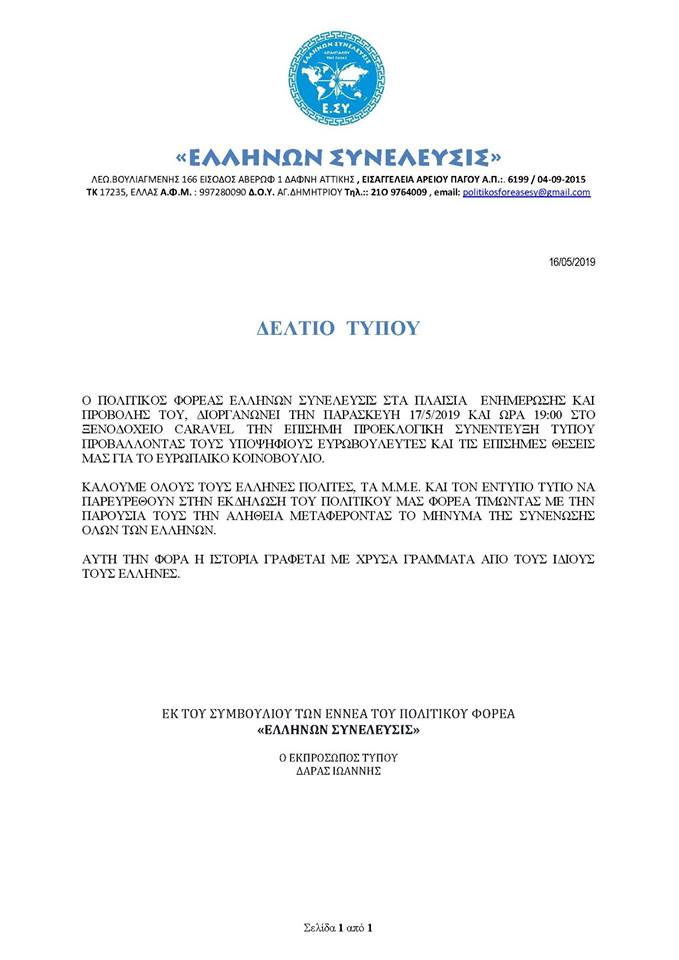 17/5/2903(2019)/Ω:19.00 PRESS CONFERENCE ΤΟΥ ΠΟΛΙΤΙΚΟΥ ΦΟΡΕΑ “ΕΛΛΗΝΩΝ ΣΥΝΕΛΕΥΣΙΣ” ΣΤΟ HOTEL CARAVEL. ΕΠΙΣΗΜΗ ΠΡΟΒΟΛΗ ΤΩΝ ΥΠ. ΕΥΡΩΒΟΥΛΕΥΤΩΝ ΚΑΙ ΤΩΝ ΘΕΣΕΩΝ ΓΙΑ ΤΟ ΕΥΡΩΚΟΙΝΟΒΟΥΛΙΟ