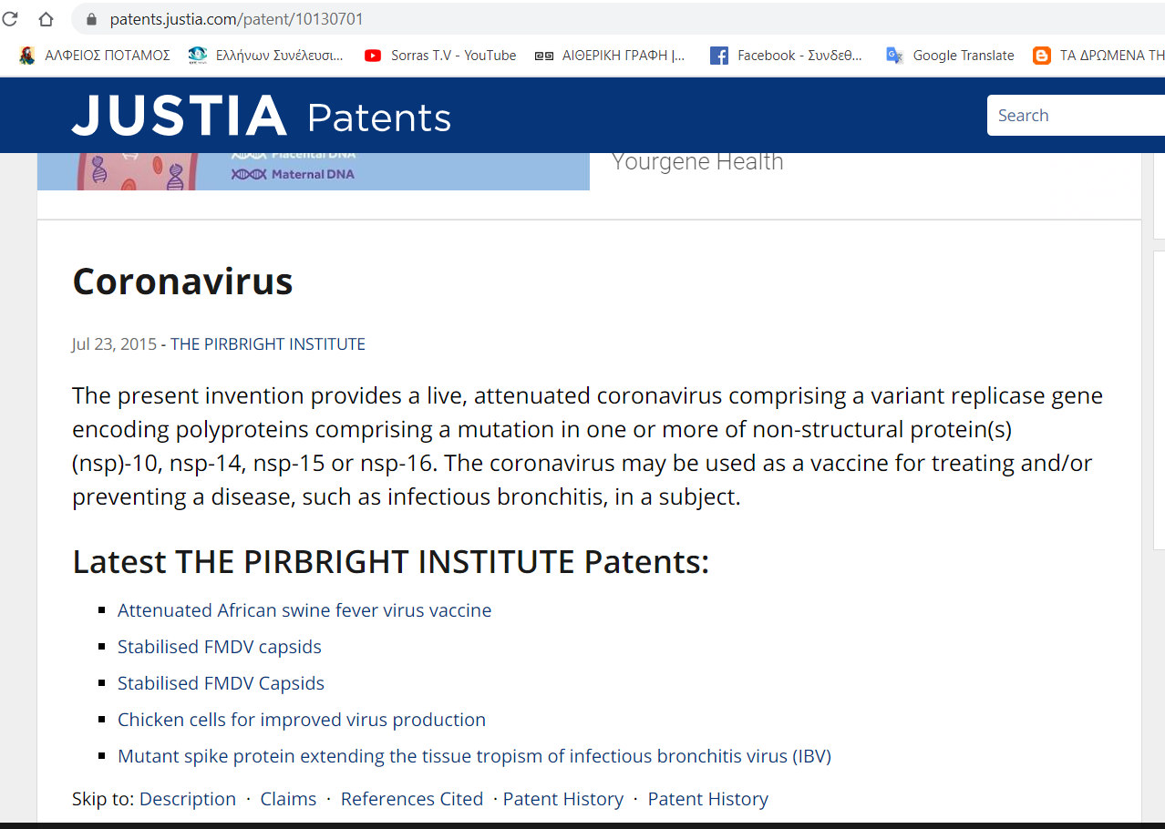ΑΠΟ ΤΟ 2015 ΥΠΑΡΧΕΙ ΔΗΜΟΣΙΕΥΜΕΝΗ ΠΑΤΕΝΤΑ ΕΦΕΥΡΕΣΗΣ ΤΟΥ ΙΟΥ ΠΟΥ ΛΕΓΕΤΑΙ CORONOVIRUS (???) ΔΕΙΤΕ ΜΕΤΑΦΡΑΣΗ ΠΑΡΑΚΑΤΩCoronavirus
