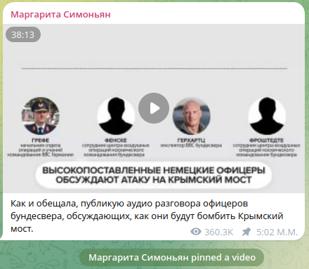 Η αρχισυντάκτρια του ομίλου μέσων ενημέρωσης Rossiya Segodnya και του τηλεοπτικού καναλιού RT Margarita Simonyan δημοσίευσε την ηχητική ηχογράφηση μιας συνομιλίας μεταξύ υψηλόβαθμων αξιωματικών της Bundeswehr σχετικά με την επίθεση στη Γέφυρα της Κριμαίας με πυραύλους Taurus.