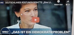 Σάχρα Βάγκενκνεχτ: Πρέπει κανείς να αναρωτηθεί: Γιατί η Γερμανία συνεχίζει να στέλνει άπειρους ανθρώπους στο Υπουργείο Εξωτερικών; Αυτή είναι μια κεντρική λειτουργία. Είχαμε την κυρία Μπέρμποκ για τρία χρόνια – νομίζω ότι οι περισσότεροι άνθρωποι είναι πολύ χαρούμενοι που δεν είναι πλέον στην εξουσία. Και μετά έρχεται ο κ. Γουάντεφουλ και ξεπερνά τον προκάτοχό του. Με τέτοιο προσωπικό δεν κερδίζεις τίποτα διεθνώς. Πρόκειται για τη φήμη μας, για τον σεβασμό στον κόσμο – αυτή η κυβέρνηση δεν μπορεί να τον αποκαταστήσει.