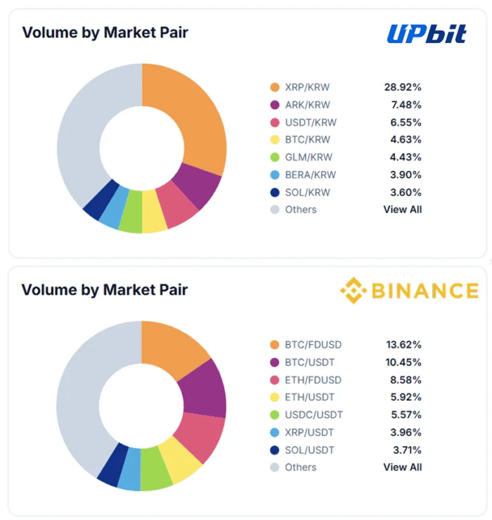 Τα στοιχεία του αναλυτή Cyclop/UPbit δείχνουν ότι το XRP έχει πάρει σαφές ➡ προβάδισμα (καί έναντι του ➡ Bitcoin), αντιπροσωπεύοντας σχεδόν το 29% του όγκου συναλλαγών στο Upbit, το μεγαλύτερο (crypto)χρηματιστήριο της Ν. Κορέας.
