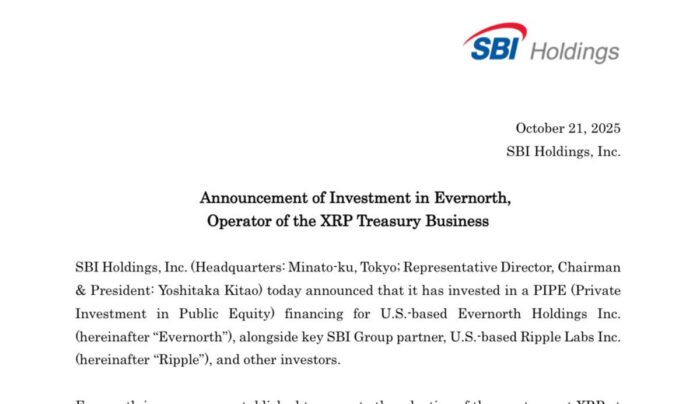 Η ➡ ιαπωνική SBI Holdings επιβεβαίωσε μια επένδυση 200 εκατομμυρίων δολαρίων στην Evernorth, ένα πρωτοποριακό θεσμικό όχημα που δημιουργήθηκε για να επιταχύνει την υιοθέτηση του XRP. Σε πρόσφατο tweet, ο Πρόεδρος και Διευθύνων Σύμβουλος της SBI Holdings, Yoshitaka Kitao, κοινοποίησε μια ανακοίνωση της εταιρείας σχετικά με αυτό.