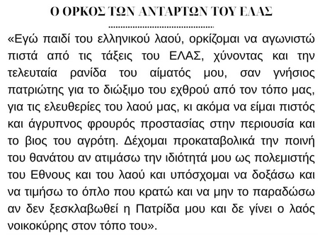 «Εγώ παιδί του ελληνικού λαού, ορκίζομαι να αγωνιστώ πιστά από τις τάξεις του ΕΛΑΣ, χύνοντας και την τελευταία ρανίδα του αίματός μου, σαν γνήσιος πατριώτης για το διώξιμο του εχθρού από τον τόπο μας, για τις ελευθερίες του λαού μας, κι ακόμα να είμαι πιστός και άγρυπνος φρουρός προστασίας στην περιουσία και το βιος του αγρότη. Δέχομαι προκαταβολικά την ποινή του θανάτου αν ατιμάσω την ιδιότητά μου ως πολεμιστής του Εθνους και του λαού και υπόσχομαι να δοξάσω και να τιμήσω το όπλο που κρατώ και να μην το παραδώσω αν δεν ξεσκλαβωθεί η Πατρίδα μου και δε γίνει ο λαός νοικοκύρης στον τόπο του».