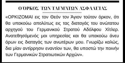 «ΟΡΚΙΖΟΜΑΙ εις τον Θεόν τον Άγιον τούτον όρκον, ότι θα υπακούω απολύτως εις τας διαταγάς του ανώτατου αρχηγού του Γερμανικού Στρατού Αδόλφου Χίτλερ. Ανατεθησόμενός μοι υπηρεσίας και θα υπακούω άνευ όρων εις διαταγάς των ανωτέρων μου. Γνωρίζω καλώς, δια μίαν αντίρρησιν εναντίον των, θα υπoστώ την ποινήν των Γερμανικών Στρατιωτικών Αρχών».