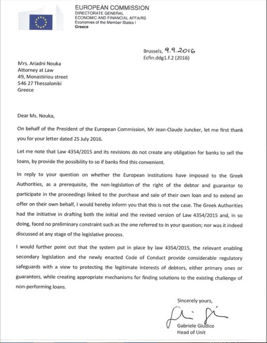 To 2016 όταν ο δημόσιος διάλογος είχε κατακλυστεί από τον (ψευδή) ισχυρισμό ότι η τρόικα επέβαλε την απαγόρευση της προτεραιότητας του δανειολήπτη στην πώληση των δανείων και έχοντας την βεβαιότητα, ότι πρόκειται για ένα μεγαλοπρεπές ΨΕΜΑ, απευθύνθηκα με επίσημη επιστολή στον Πρόεδρο της Κομισιόν, κ. Γιούνκερ.